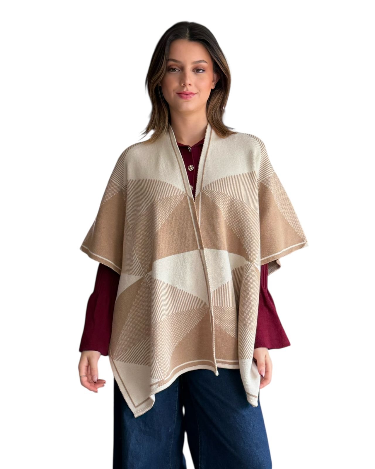 Capa de tejido de punto, estampado de cuadros camel con blanco.