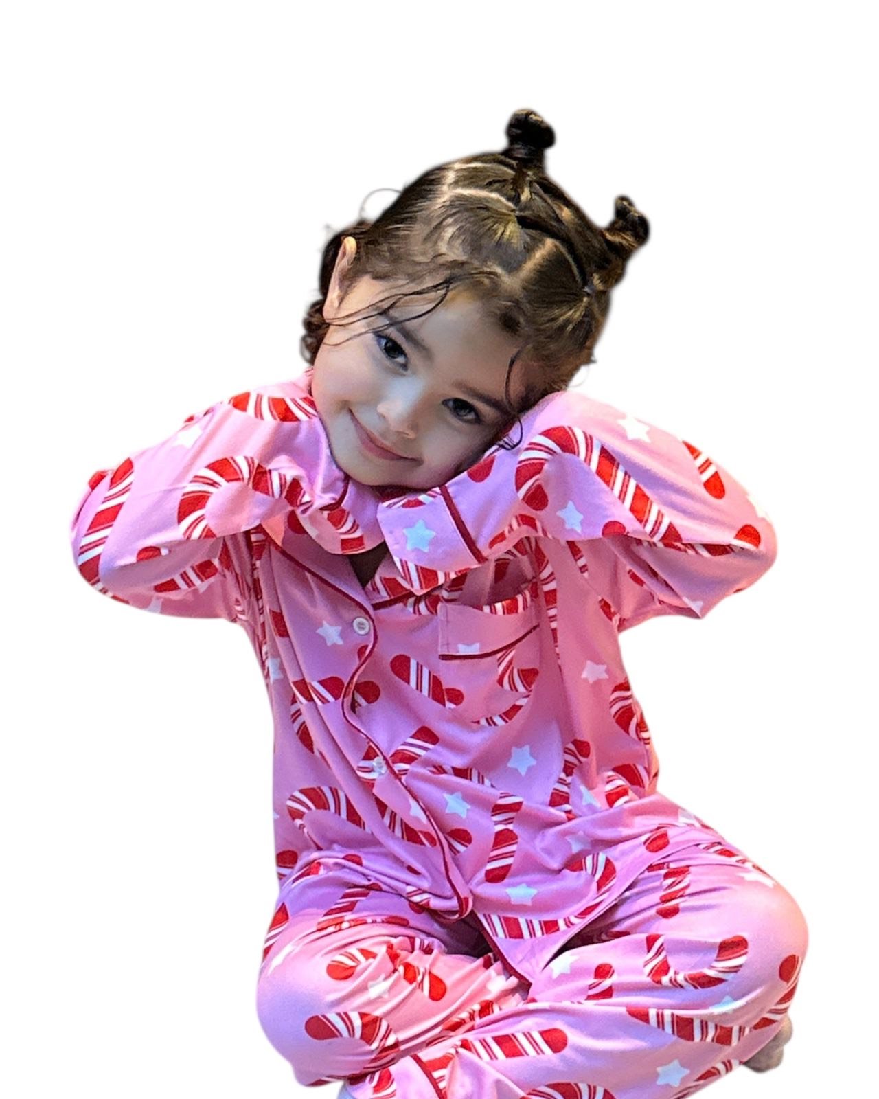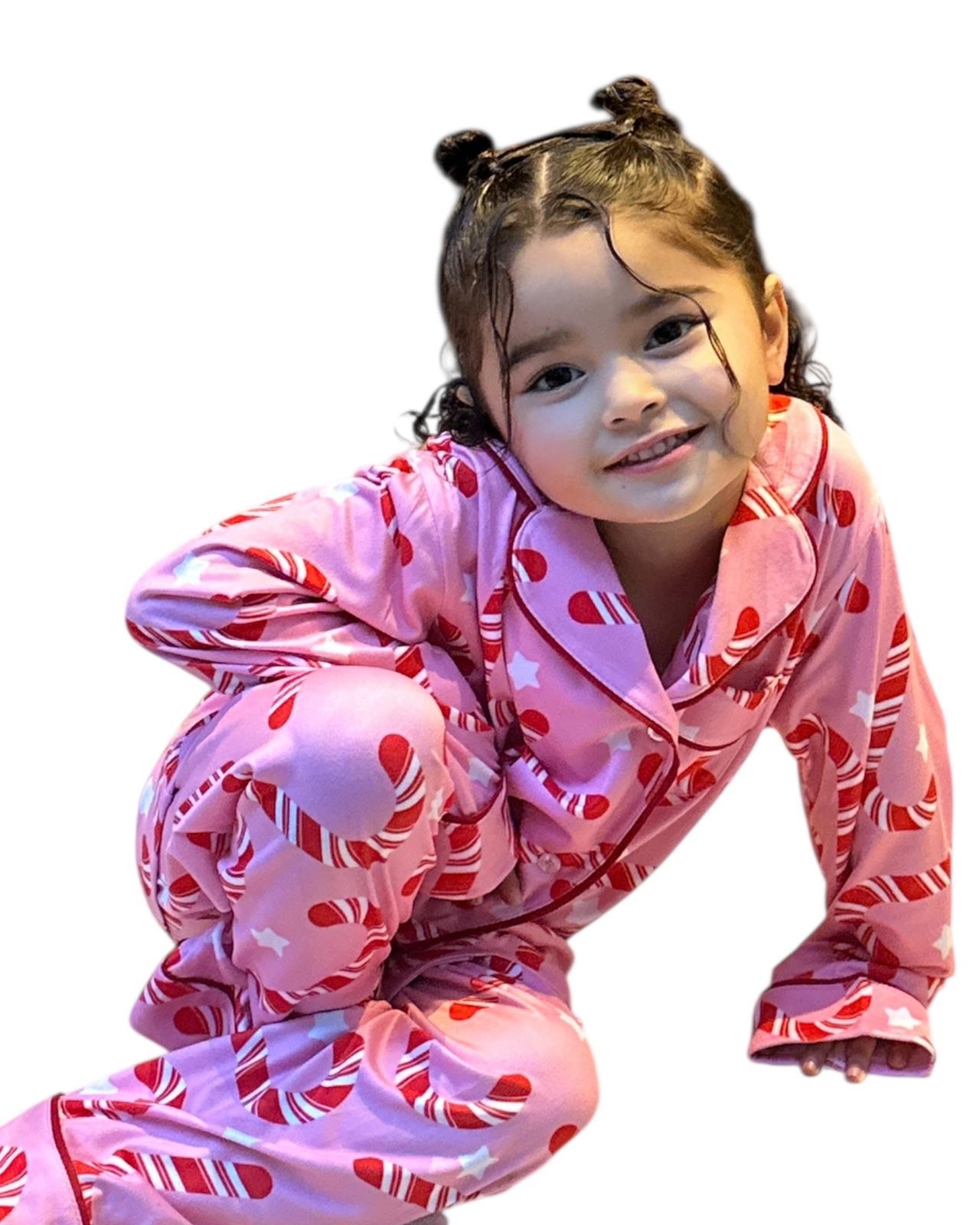 Conjunto de pijama de pantalón y blusa con botones de tela textura suave, estampado bastones navideños color rosa con rojo. disponible tambien para mamá.