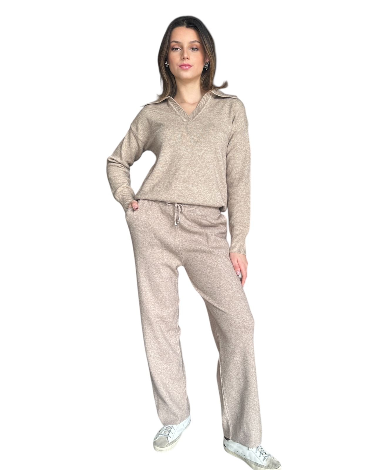 Set de blusa manga larga cuello sport con pantalón corte recto y jareta de tejido de punto color negro, Camel y hueso.