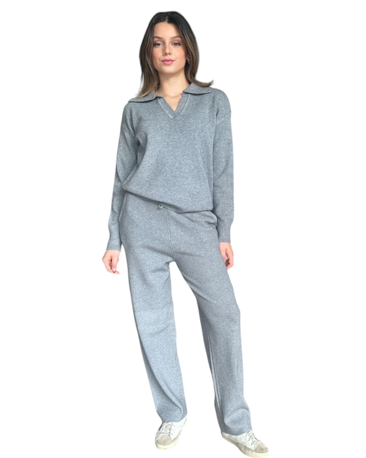 Set de pantalón pierna recta con Jareta y bolsas laterales, suéter cuello sport de tejido muy suave, color gris.