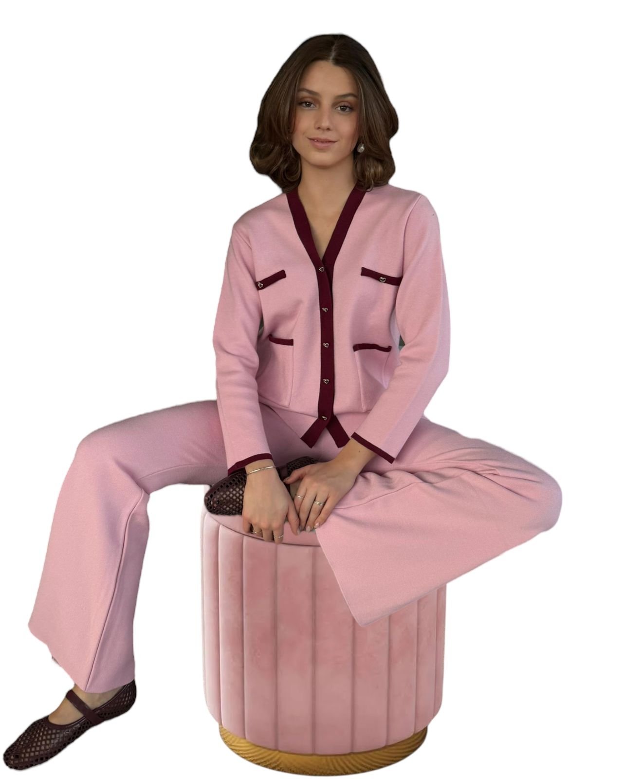 Set de suéter con botón de corazón, pantalón campana con bolsas delanteras y aberturas laterales, color rosa pastel con Burgundy