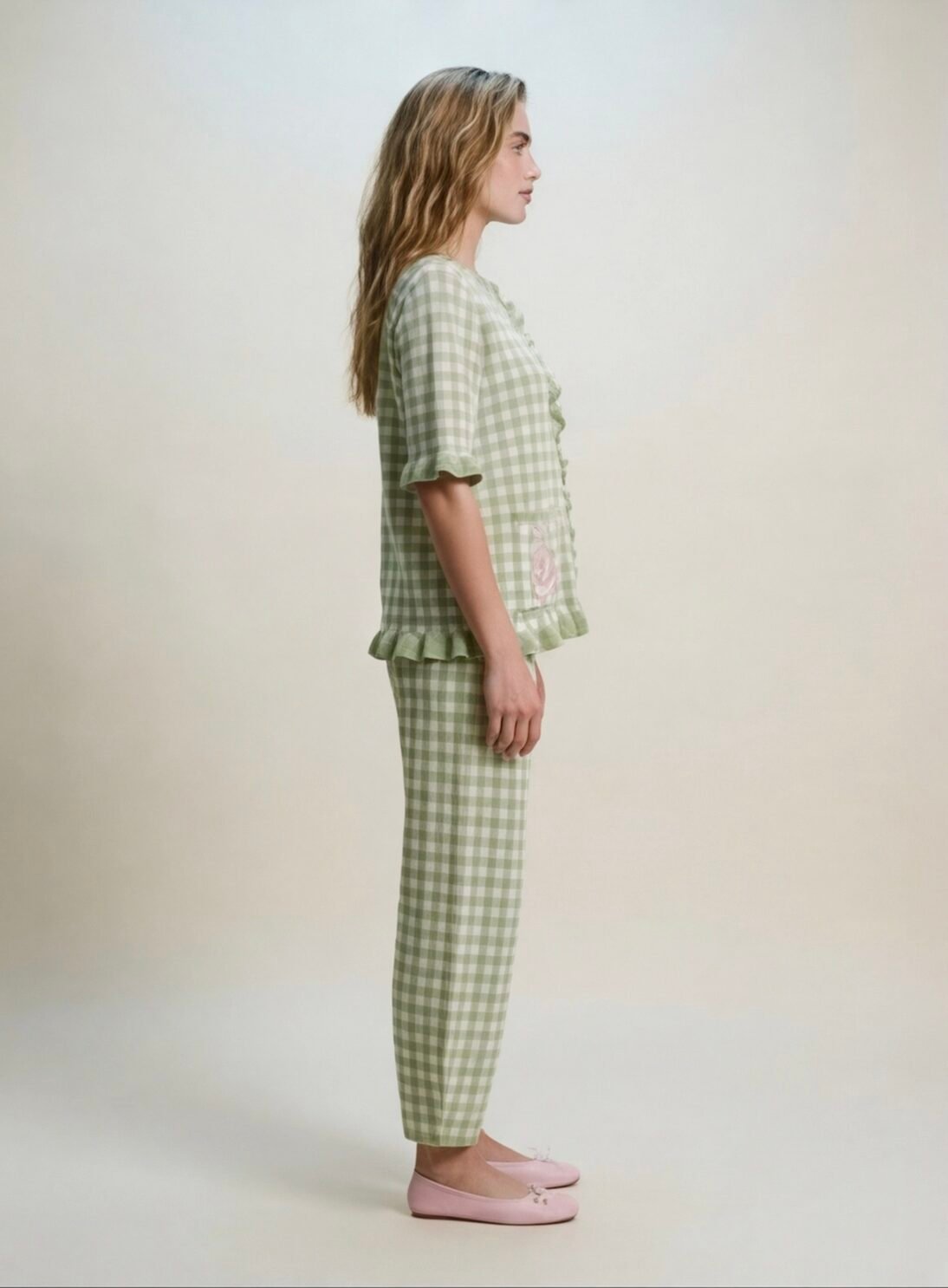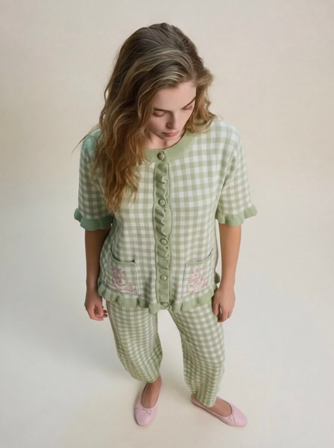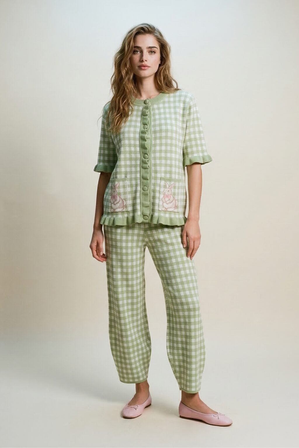 Set de blusa con manga corta, botones de broche forrados, bolsas en la parte inferior y estampado de conejo, pantalón balloon, de tejido de punto ligero, estampado de cuadros color verde olivo con rosa pastel
