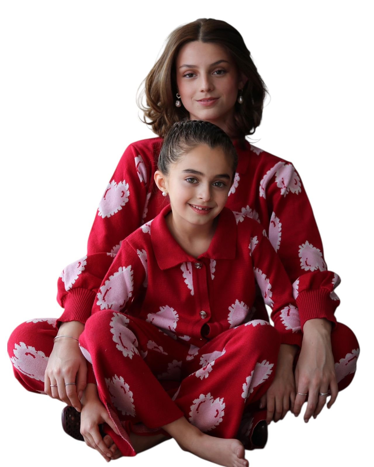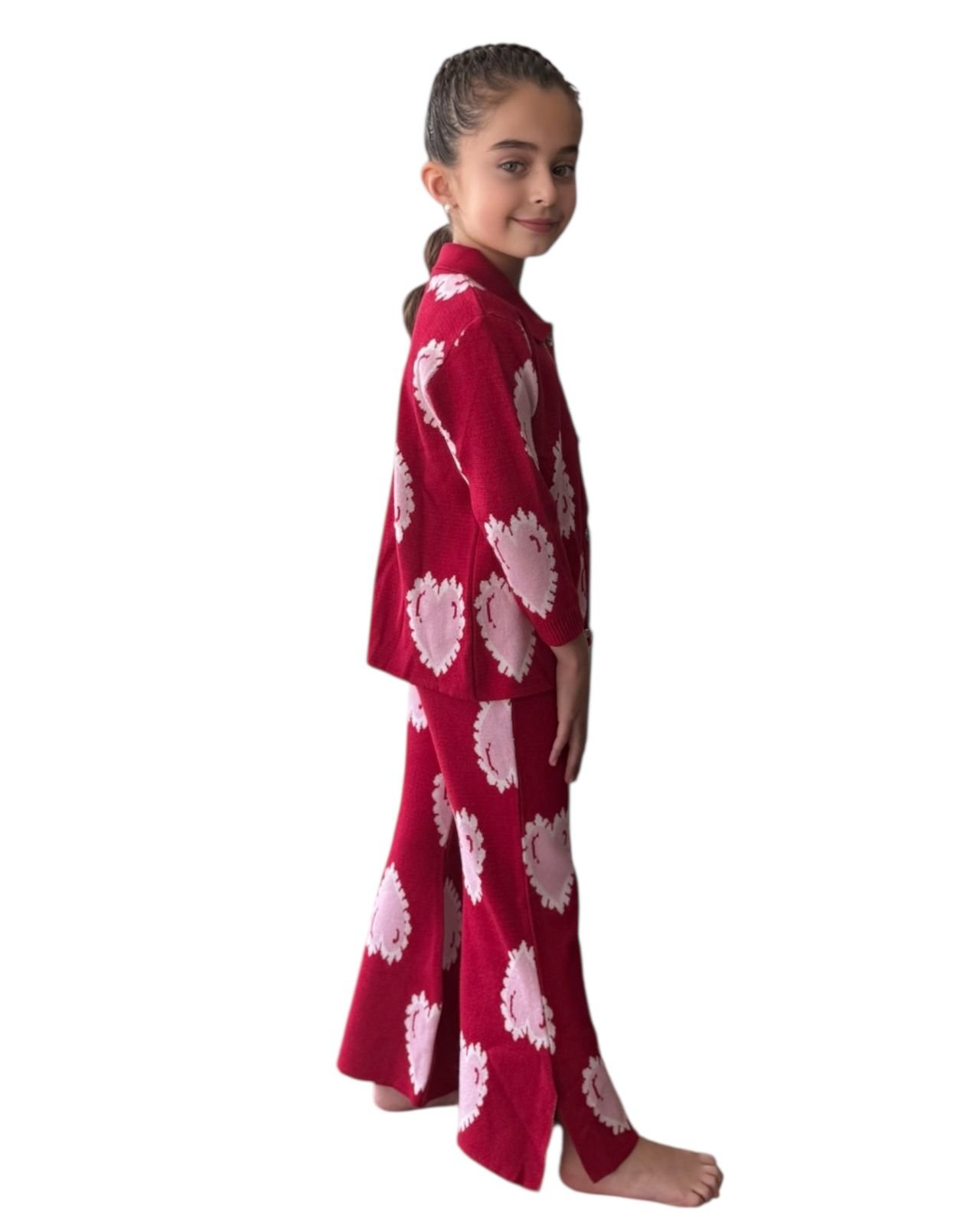 Set de suéter con botón piedra, pantalón campana con aberturas laterales, estampados de corazones color rojo y  rosa pastel