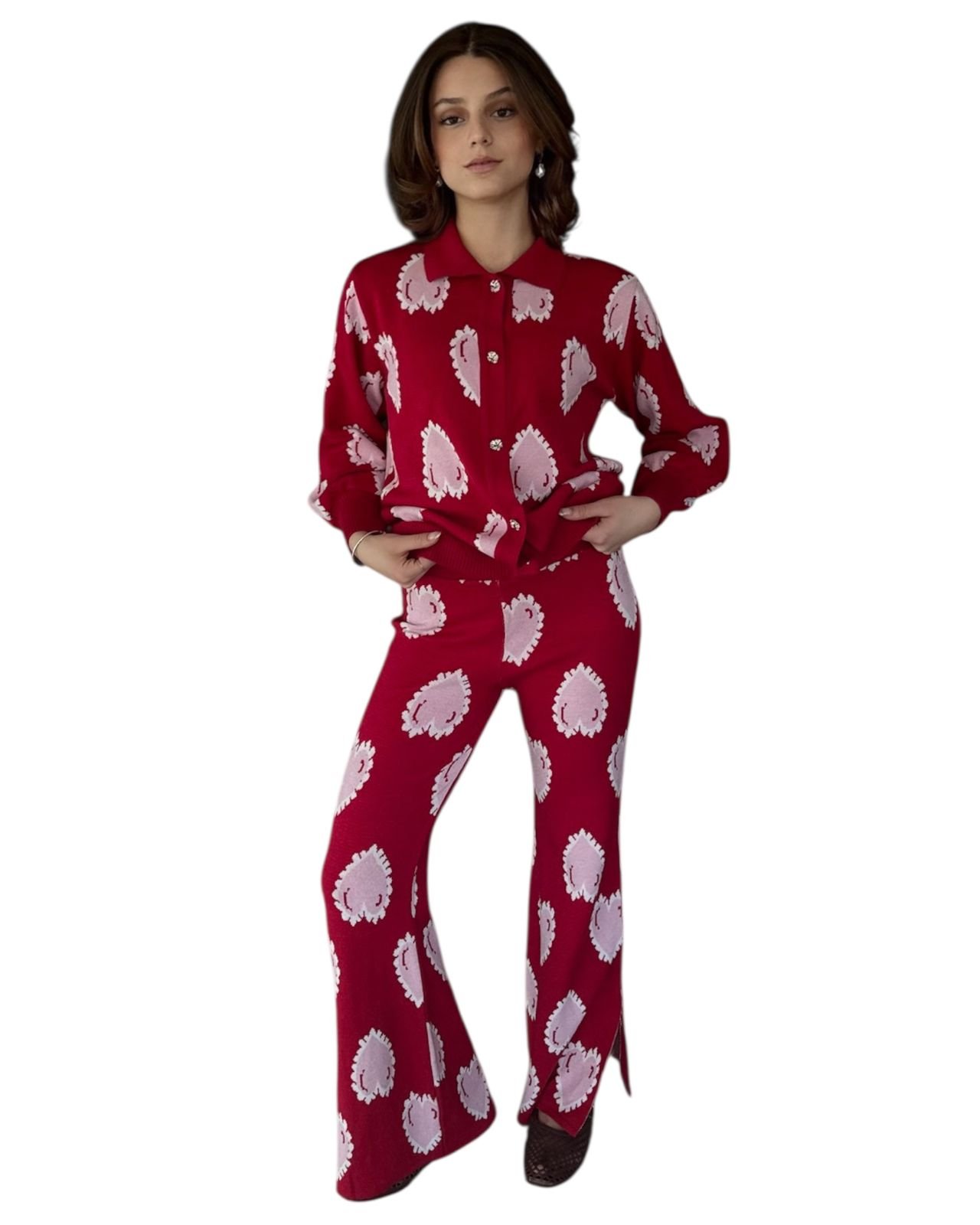 Set de suéter con botón piedra, pantalón campana con aberturas laterales, estampado de corazones color rojo y  rosa pastel