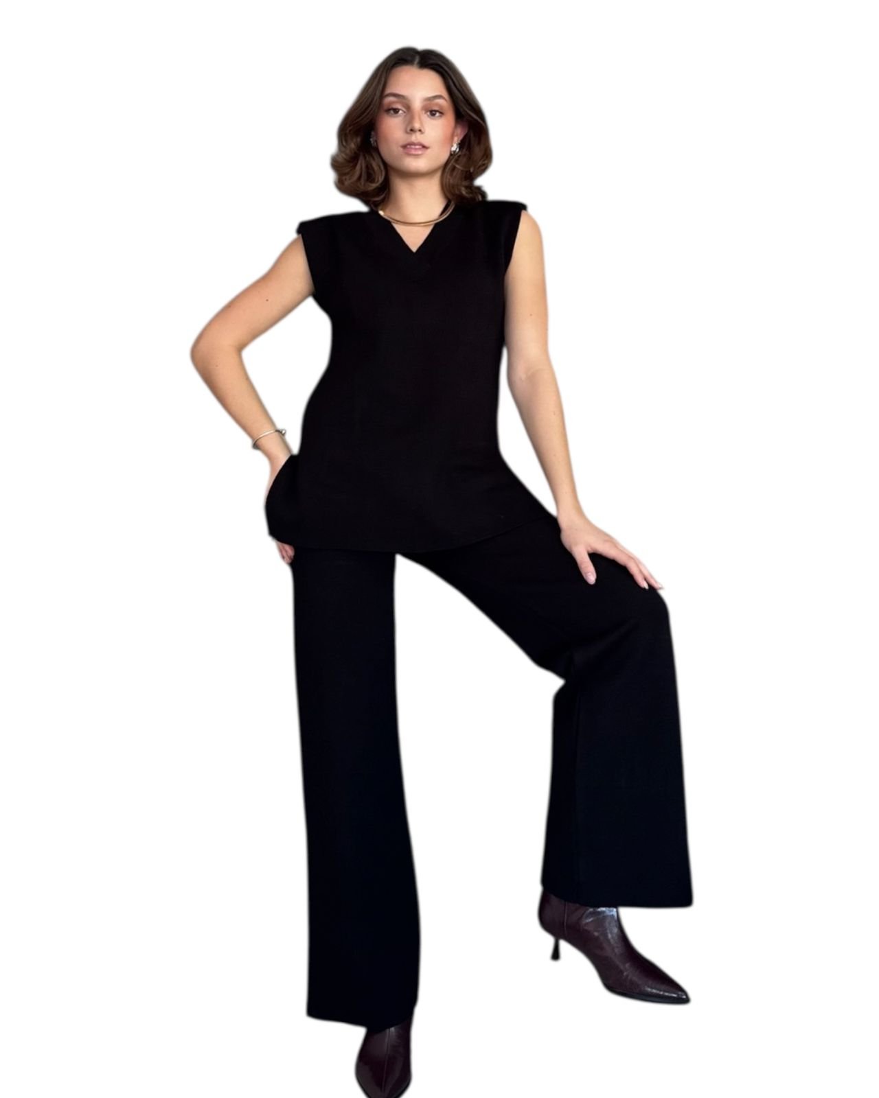 Set de chaleco largo con aberturas laterales y hombreras, con pantalón campana reducida de tejido de punto