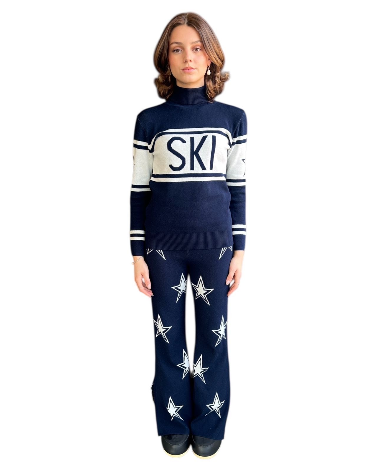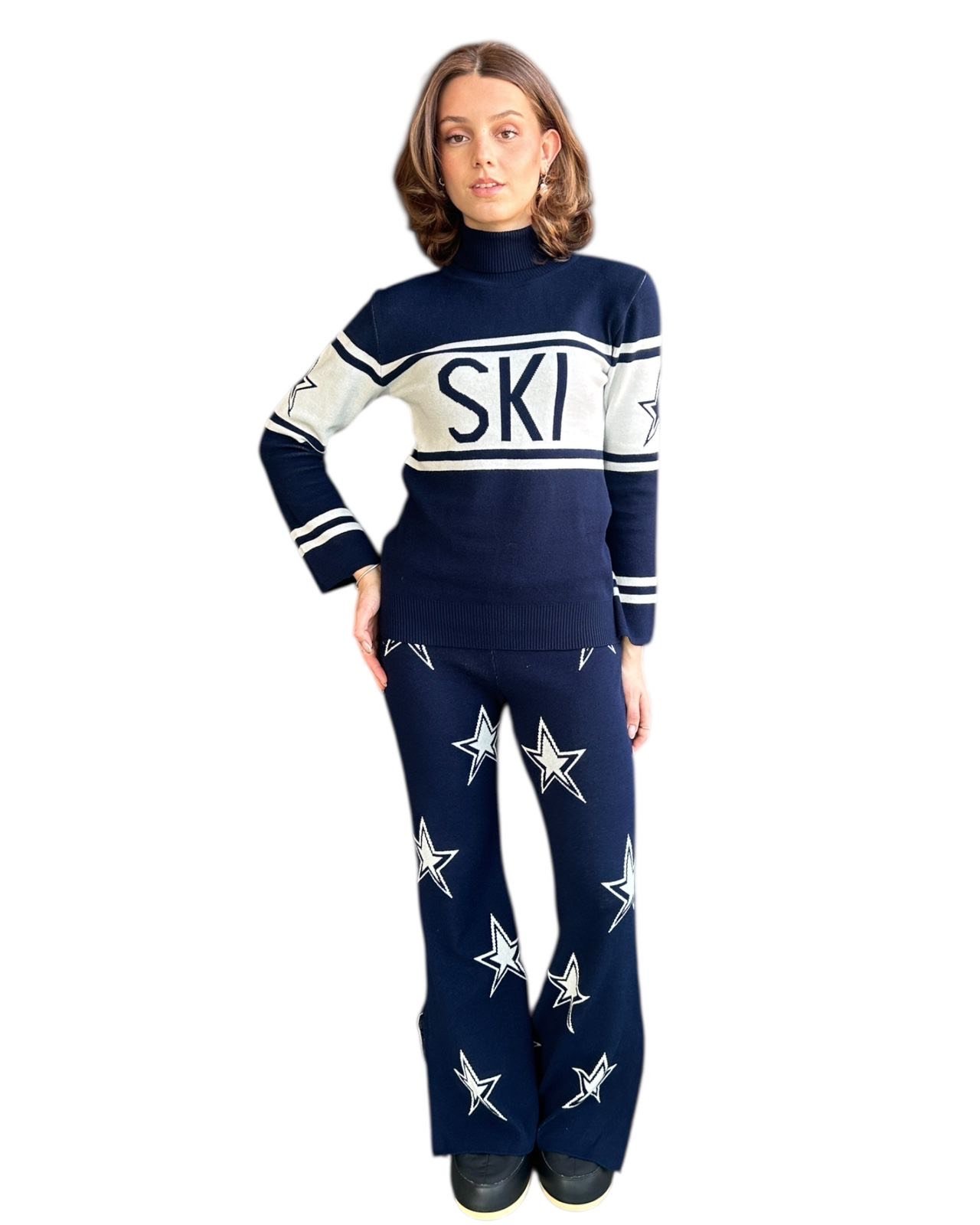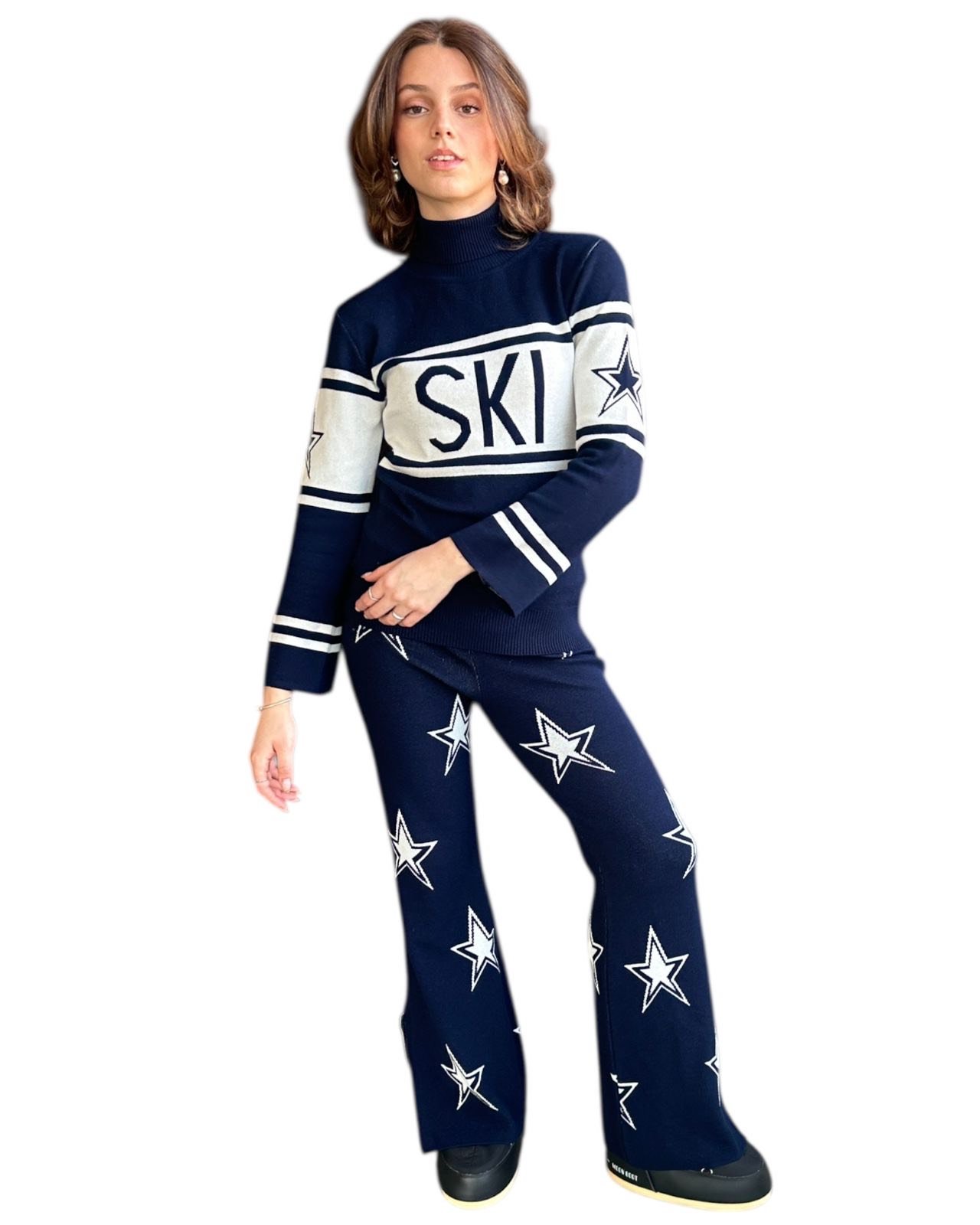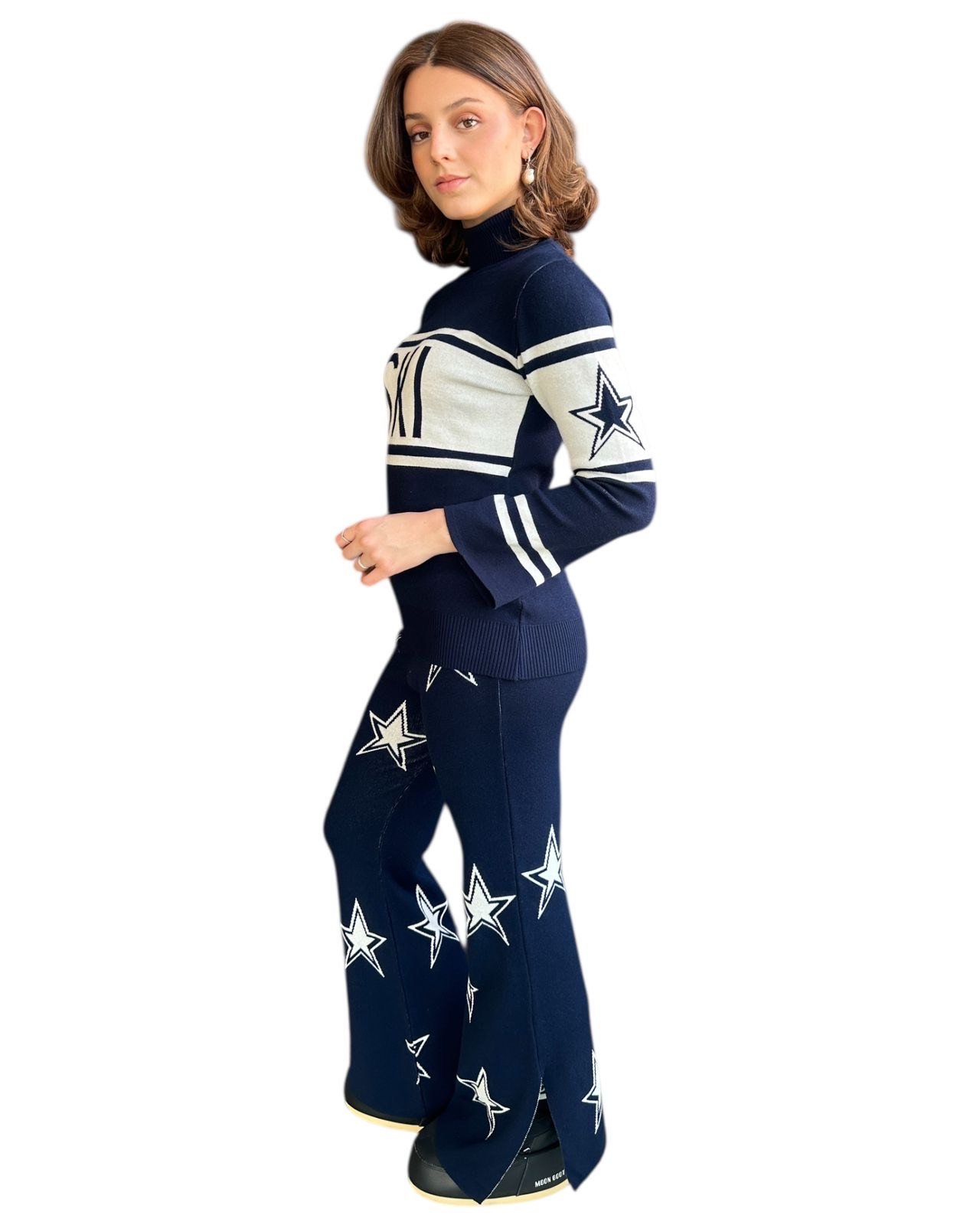Set de tejido de punto, suéter ski cuello alto manga campana y pantalón con aberturas laterales de estrellas fondo azul marino con blanco