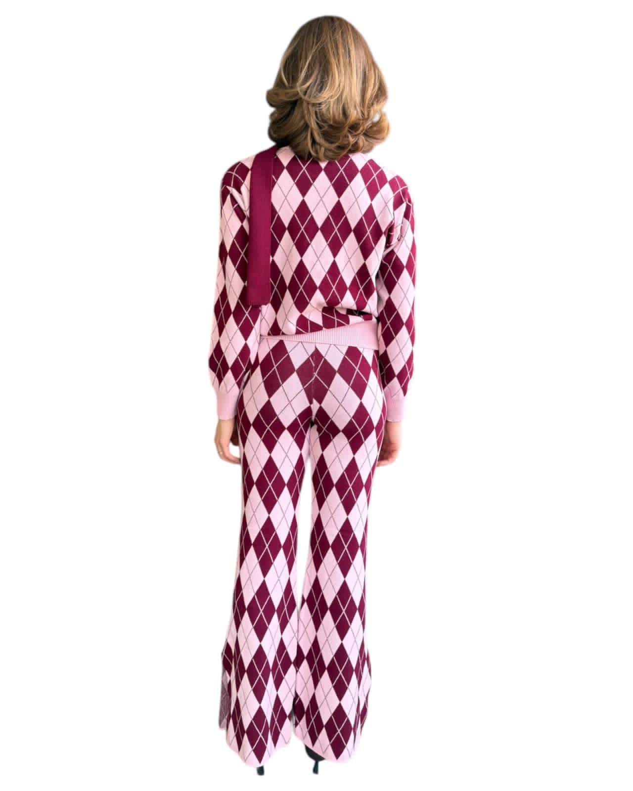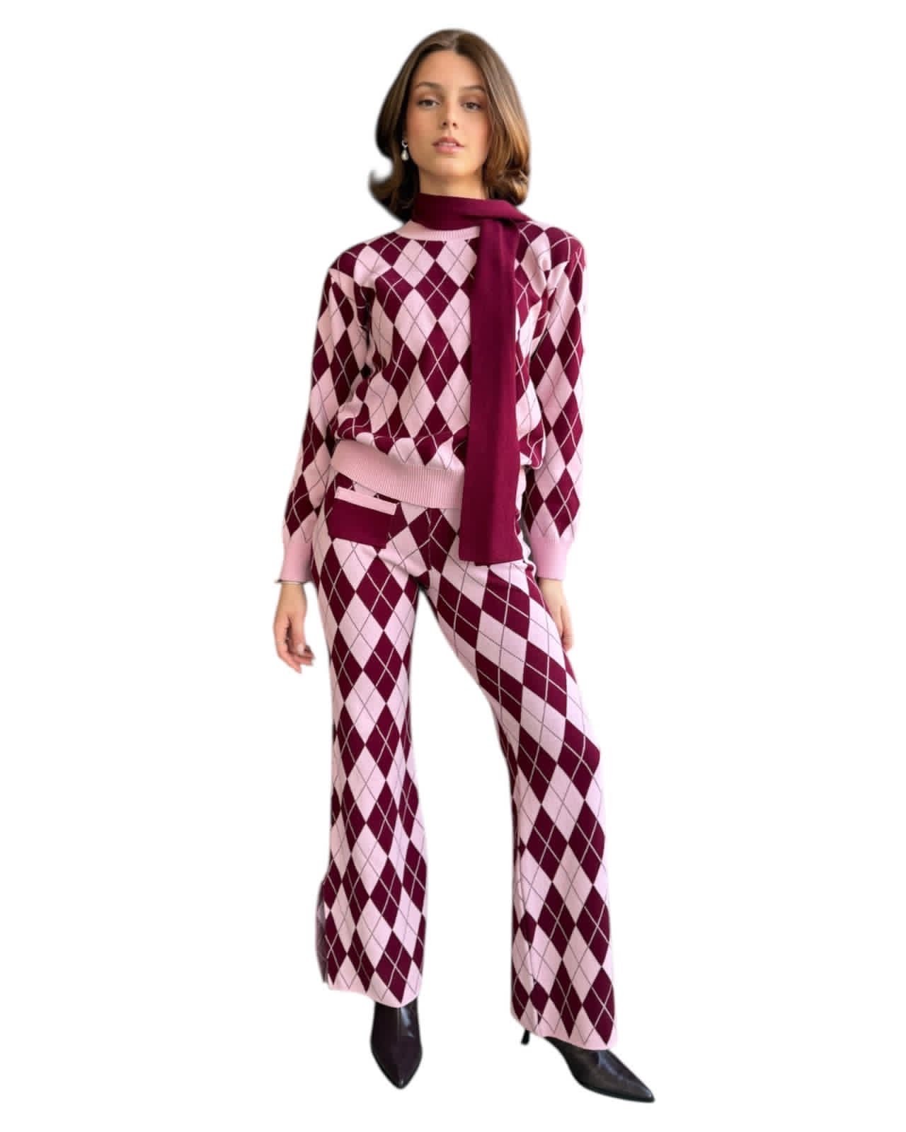 Set de sueter cuello redondo con chocker, pantalón campana con bolsas delanteras y aberturas laterales, estampados rombos color burgundy y rosa pastel
