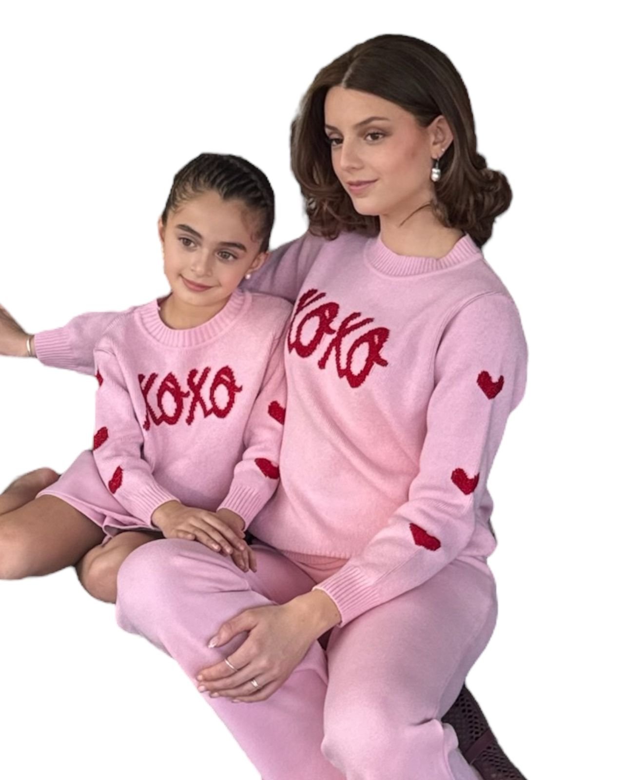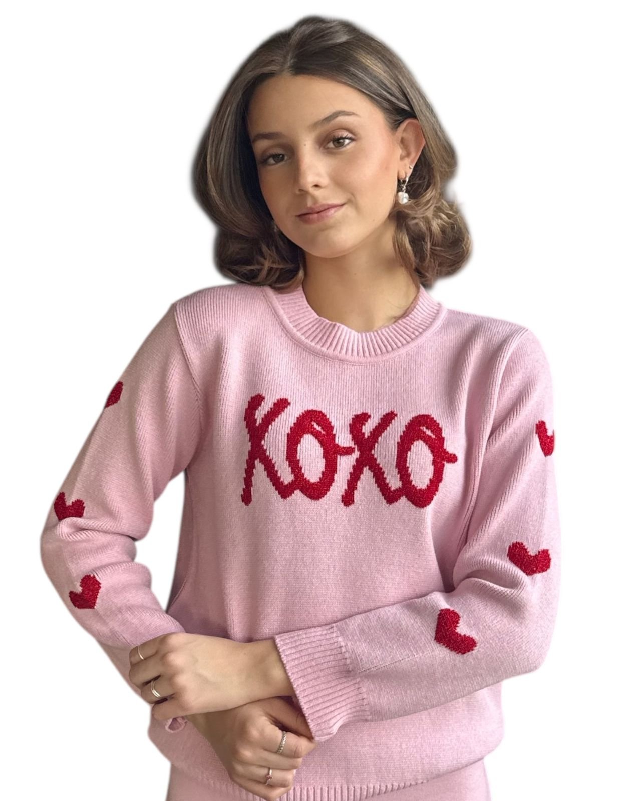 Suéter de tejido de punto color rosa con rojo, hilo glitter