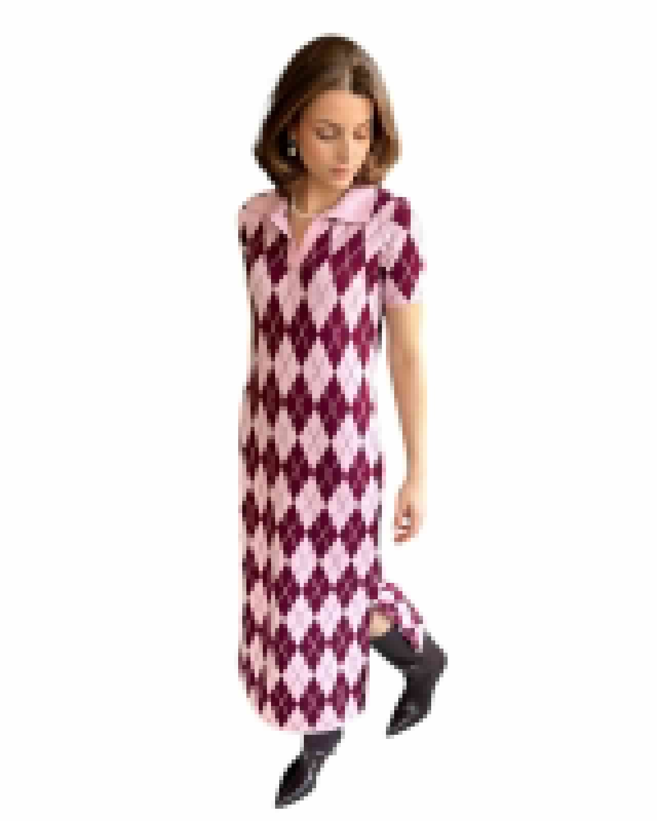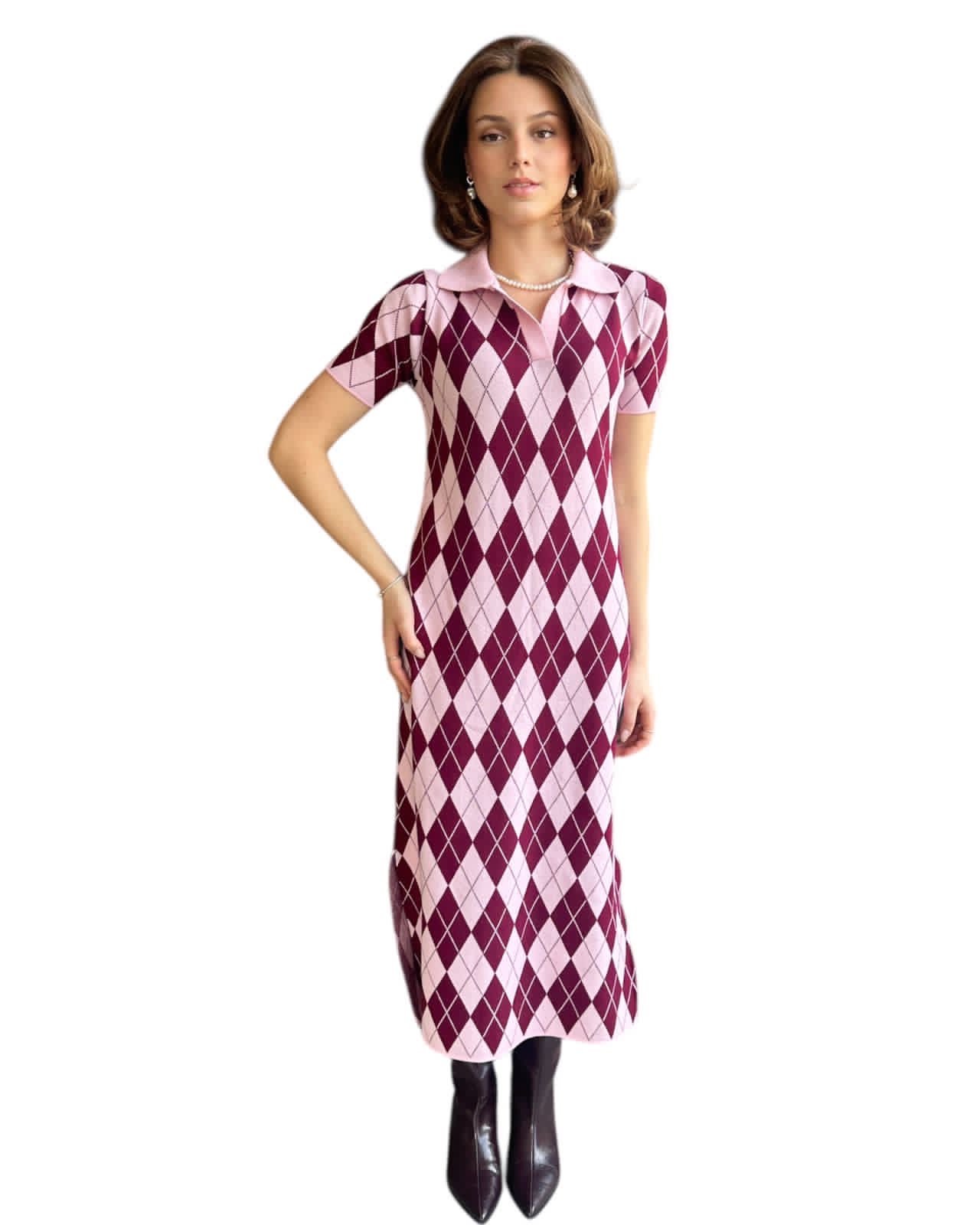 Vestido de tejido de punto manga corta con cuello sport, estampado rombos color burgundy y rosa pastel